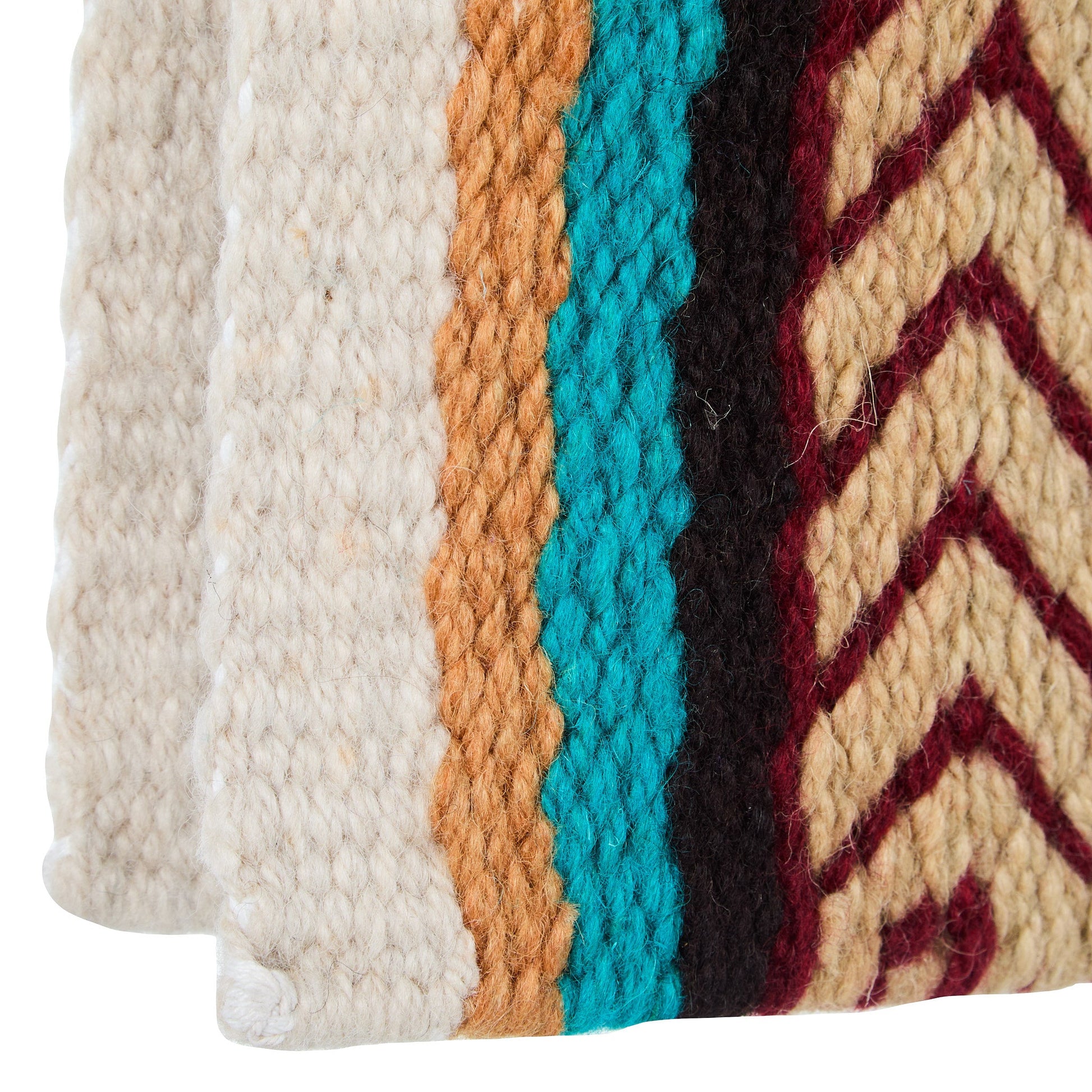 Introducing the latest addition to Mayatex's saddle blanket collection, the Iron Horse. The Iron Horse saddle blanket design features a unique, braided rope design that compliments any western horse rider! This exquisite piece is adorned with a sophisticated color palette of Ivory, Cream, Teal, Cofee, Tibetan Red, and Sheepskin, adding a touch of elegance to your equestrian gear. Measuring 36" x 34", this saddle blanket is crafted from New Zealand Wool, ensuring a blend of luxurious comfort and durability. Its distinctive design, featuring rich and vibrant tones of Ivory, Cream, Teal, Cofee, Tibetan Red, and Sheepskin, adds a timeless and stylish element to your riding ensemble. Product Number: 1425-8