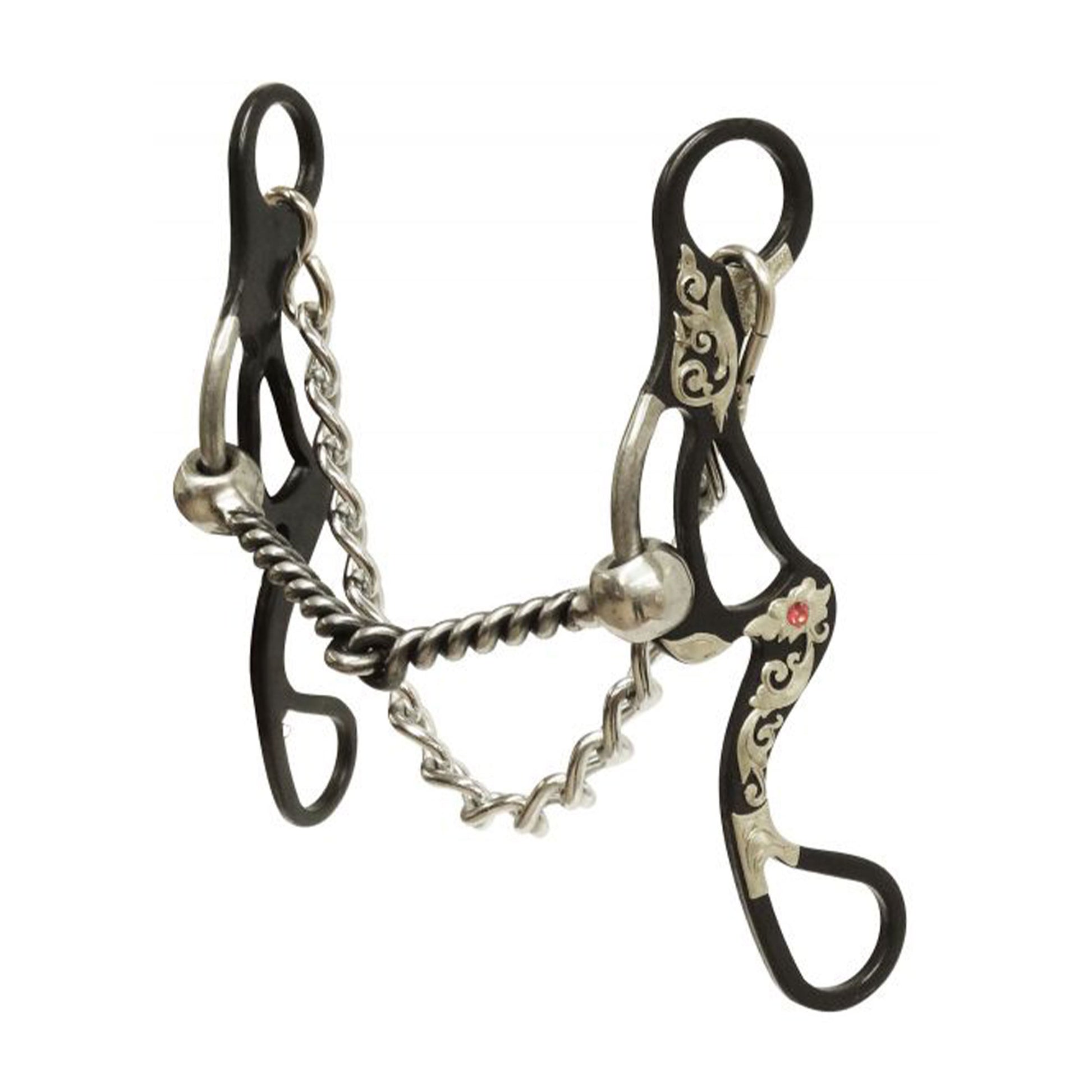 Showman ® Blued steel shank with twisted sliding mouth. This bit features 7.5" blued steel shanks with engraved silver overlay accented with red crystal rhinestones and an 11" curb chain. 5" stainless steel twisted sliding mouth piece.