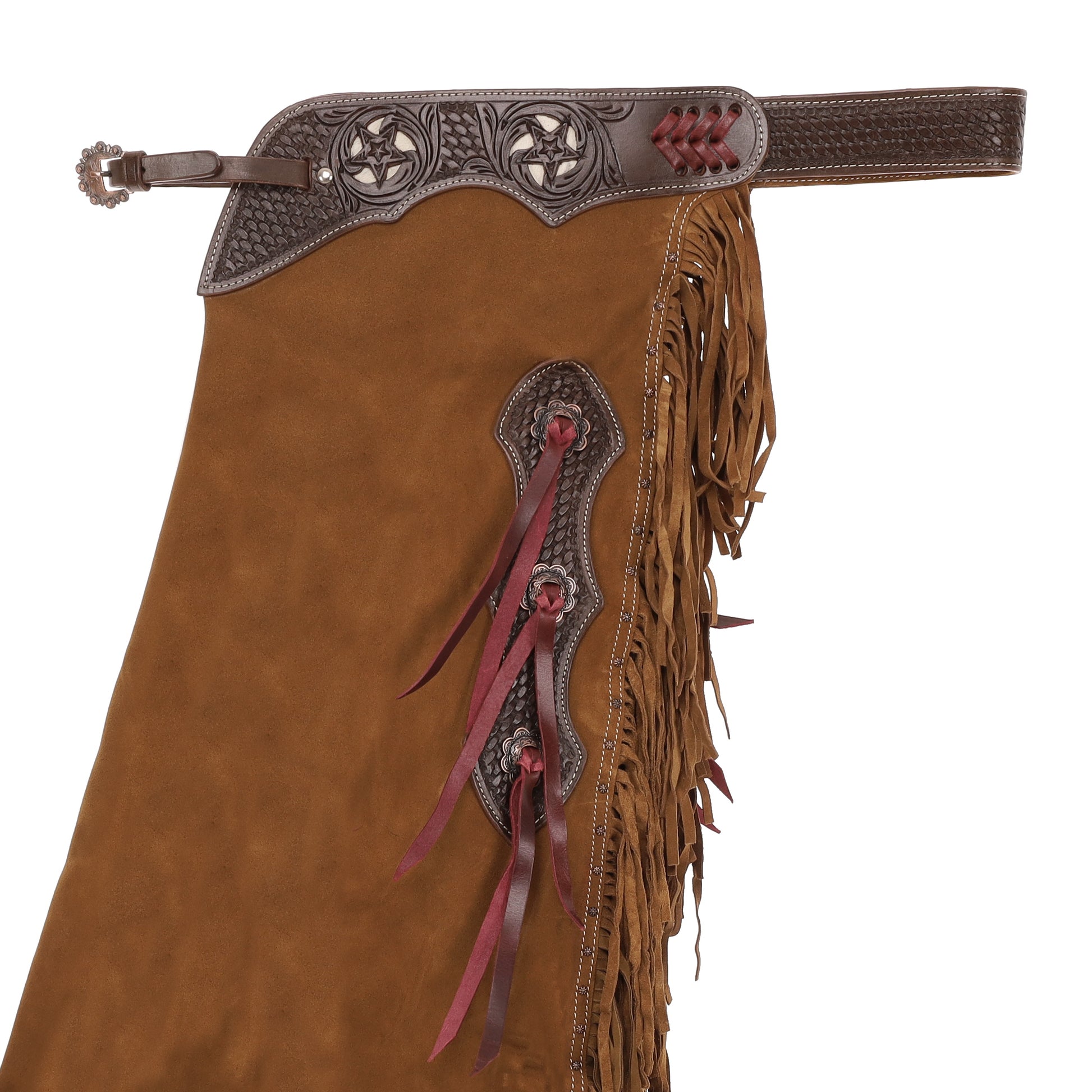 Ride in timeless western style with the Showman® Cedarwood Chinks, crafted for comfort, durability, and standout appeal. Featuring a nutmeg suede body accented with rich chocolate tones, these chinks are as practical as they are striking. Tooled leather accents add an elegant touch, while copper berry slotted conchos lend a classic, polished finish.