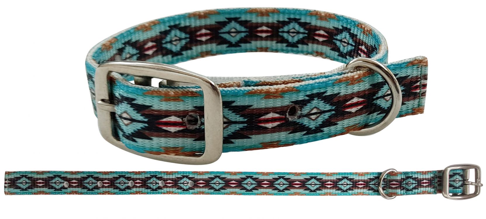 Showman Couture ® Teal Southwest designed nylon dog collar. Durable flat 2ply nylon with nickel plated buckle and D ring to easily attach a leash.